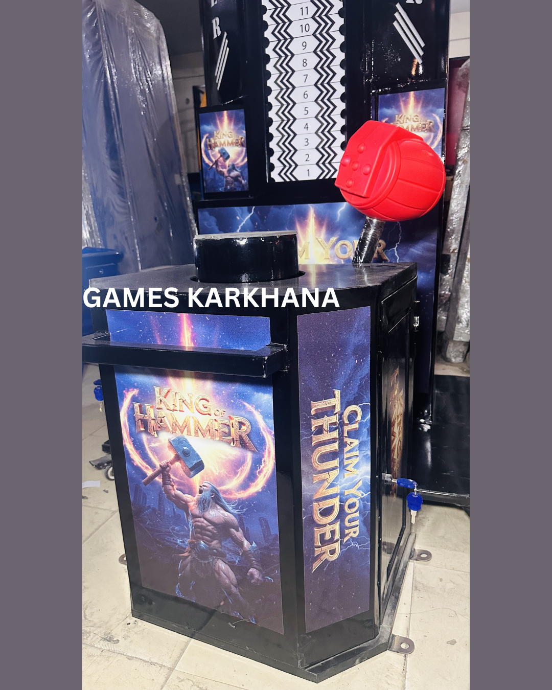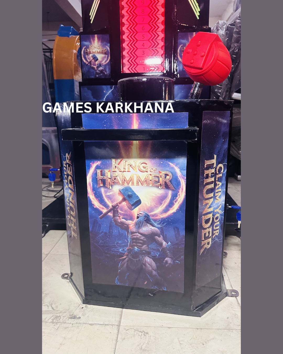 King of Hammer – Thunder Edition, a high-impact strength tester machine designed to attract crowds and boost revenue. Proudly manufactured by Games Karkhana, this heavy-duty hammer game is built with premium quality metal to withstand powerful hits and continuous commercial use.